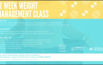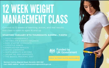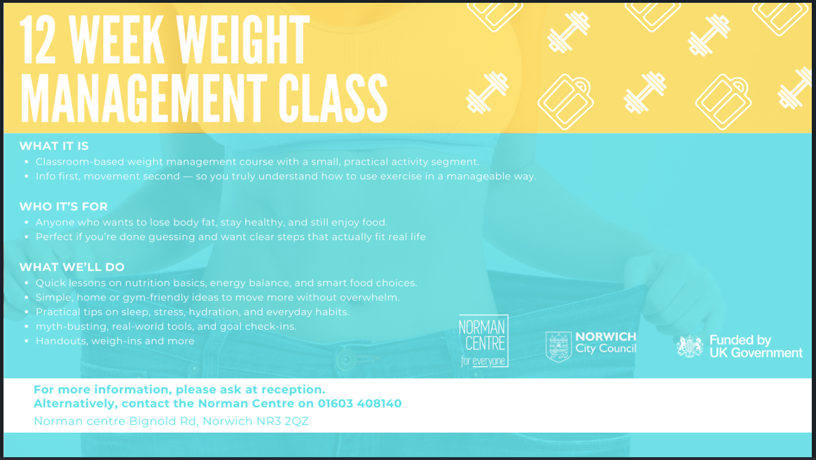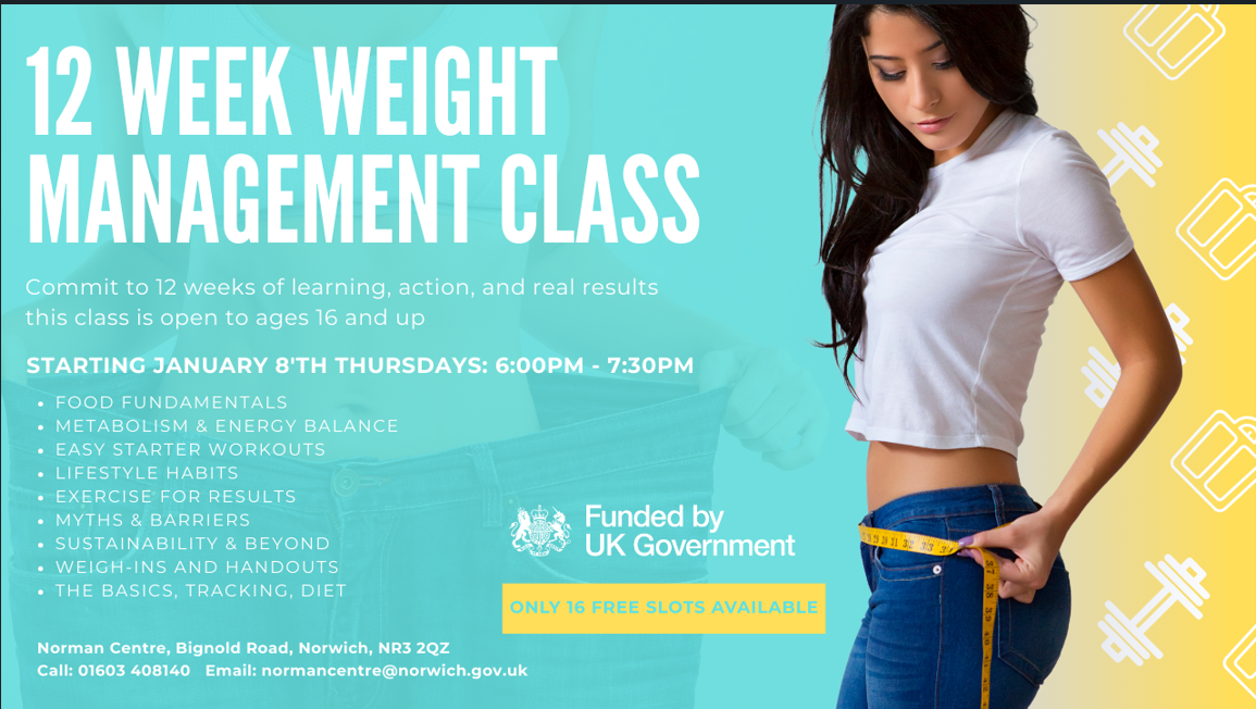 Introducing our FREE OF CHARGE 12 week weight management sessions which will begin 8th January at the Norman Centre. Classes are run Thursday evenings from 18.00.