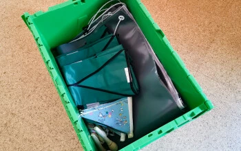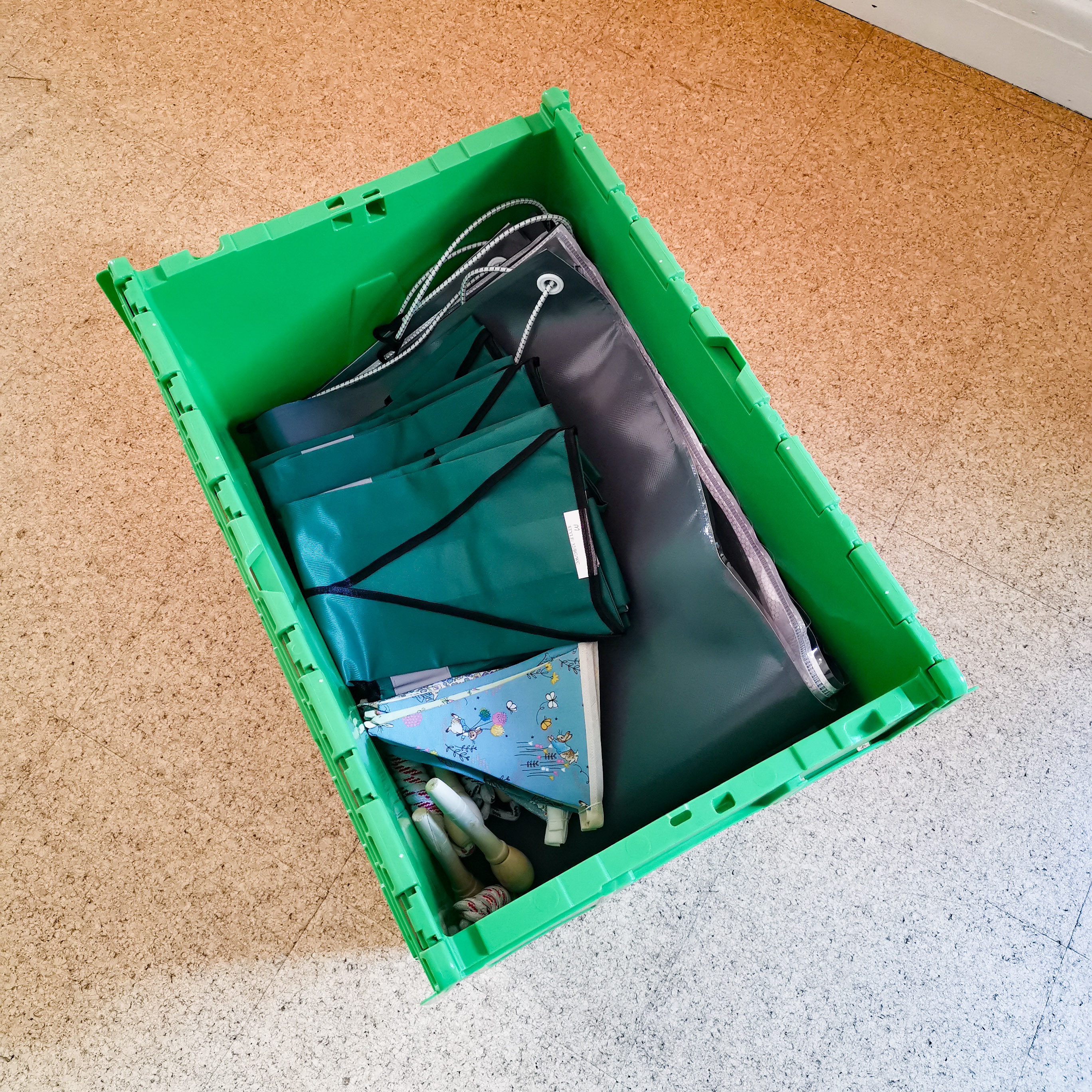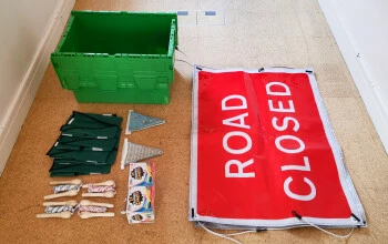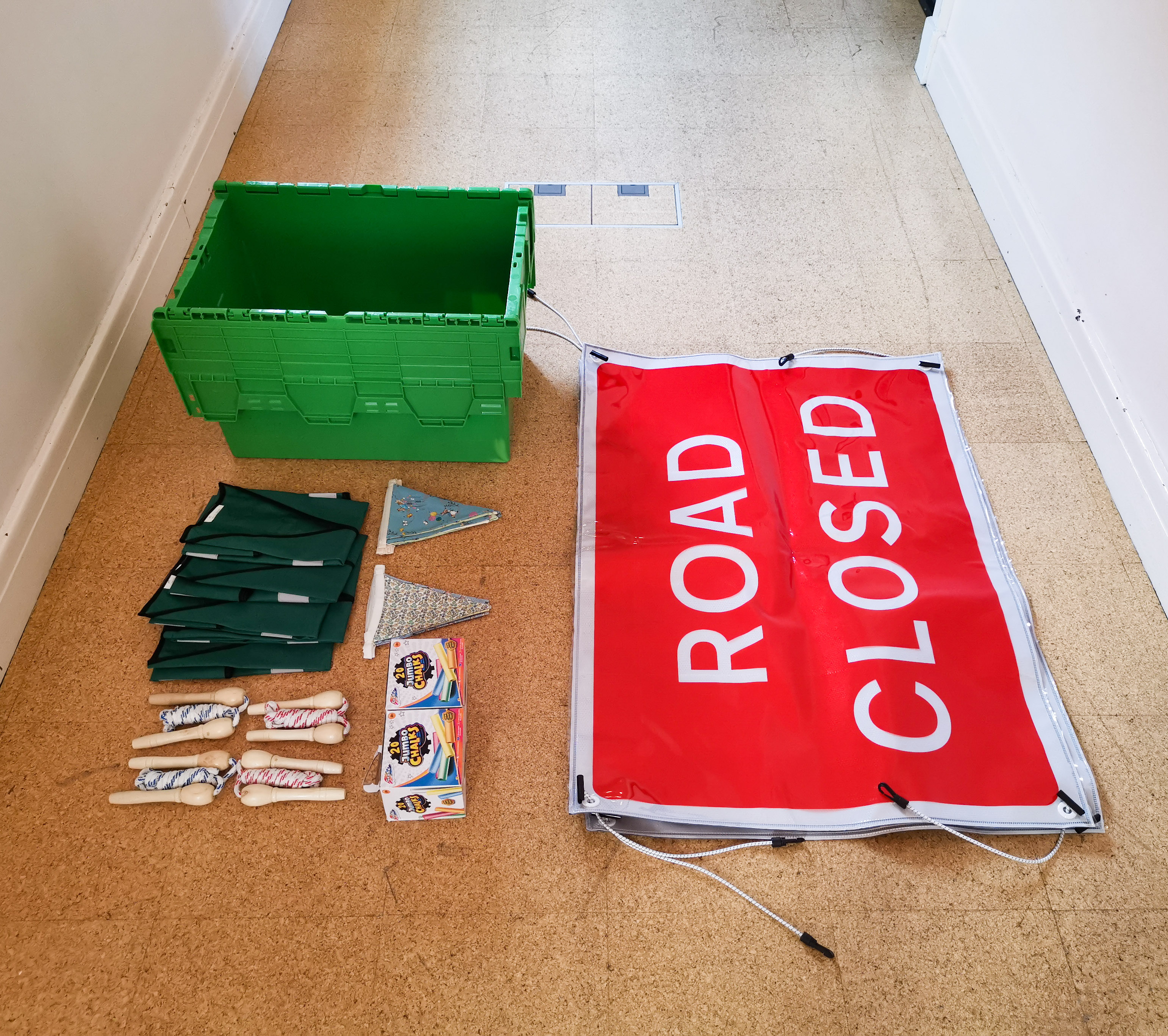 ? This medium sized plastic crate contains some useful items to get a play street up and running.