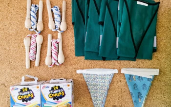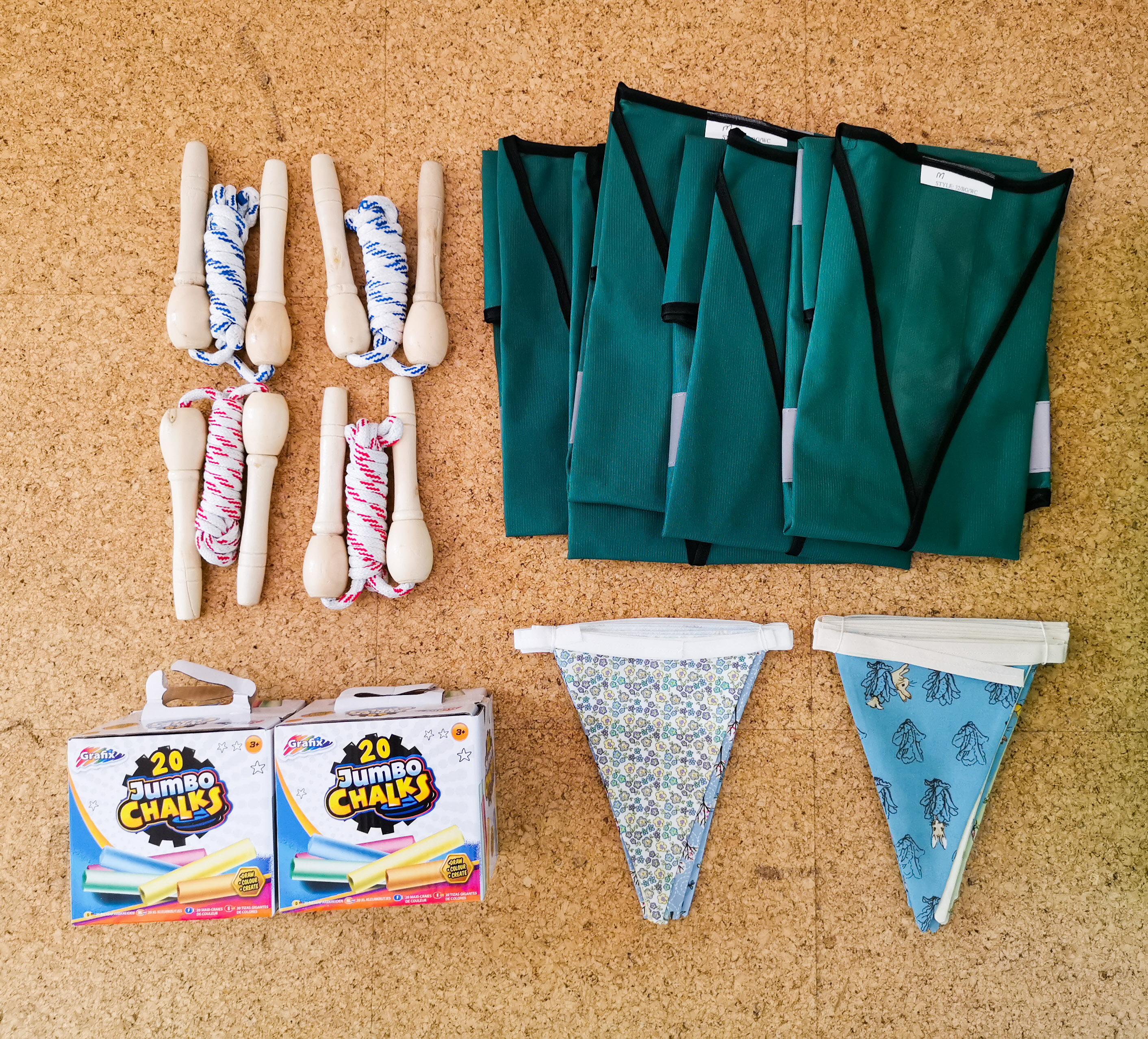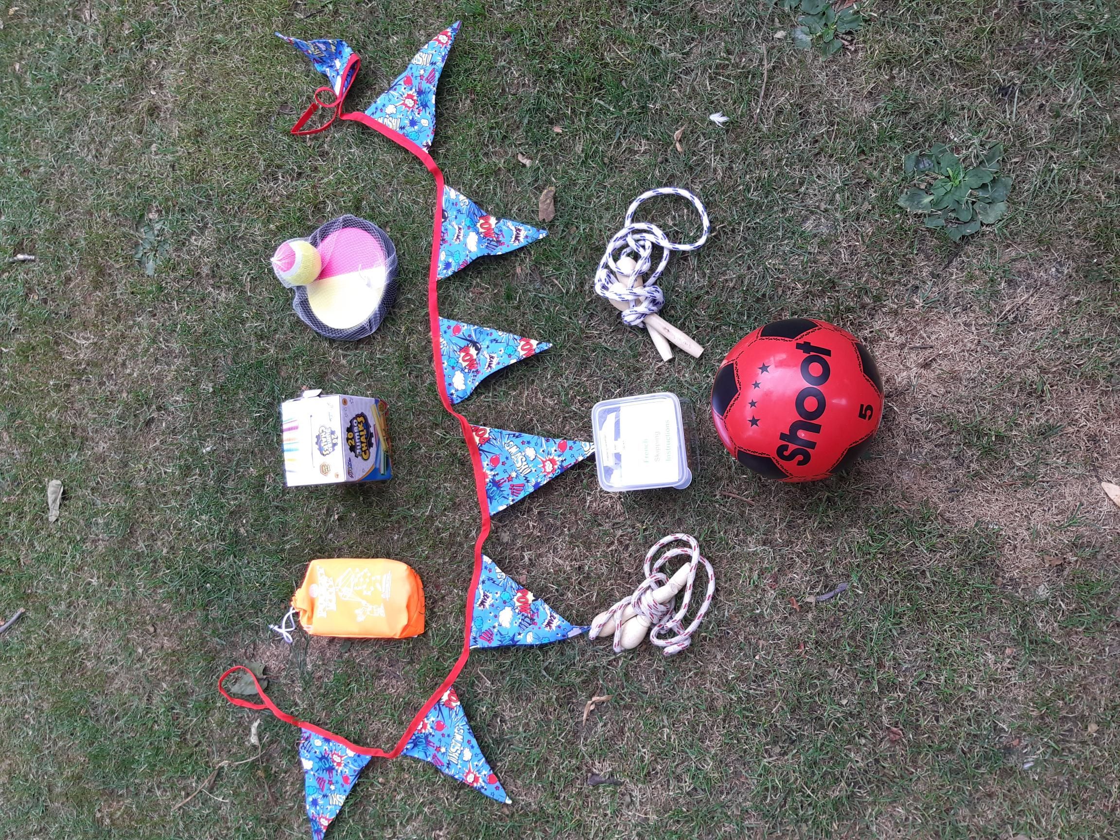 ✅ small games including skipping rope, skipping elastic, jacks, pocket kite, Velcro bat and ball and a football.