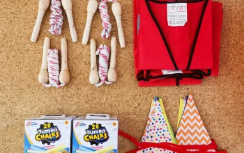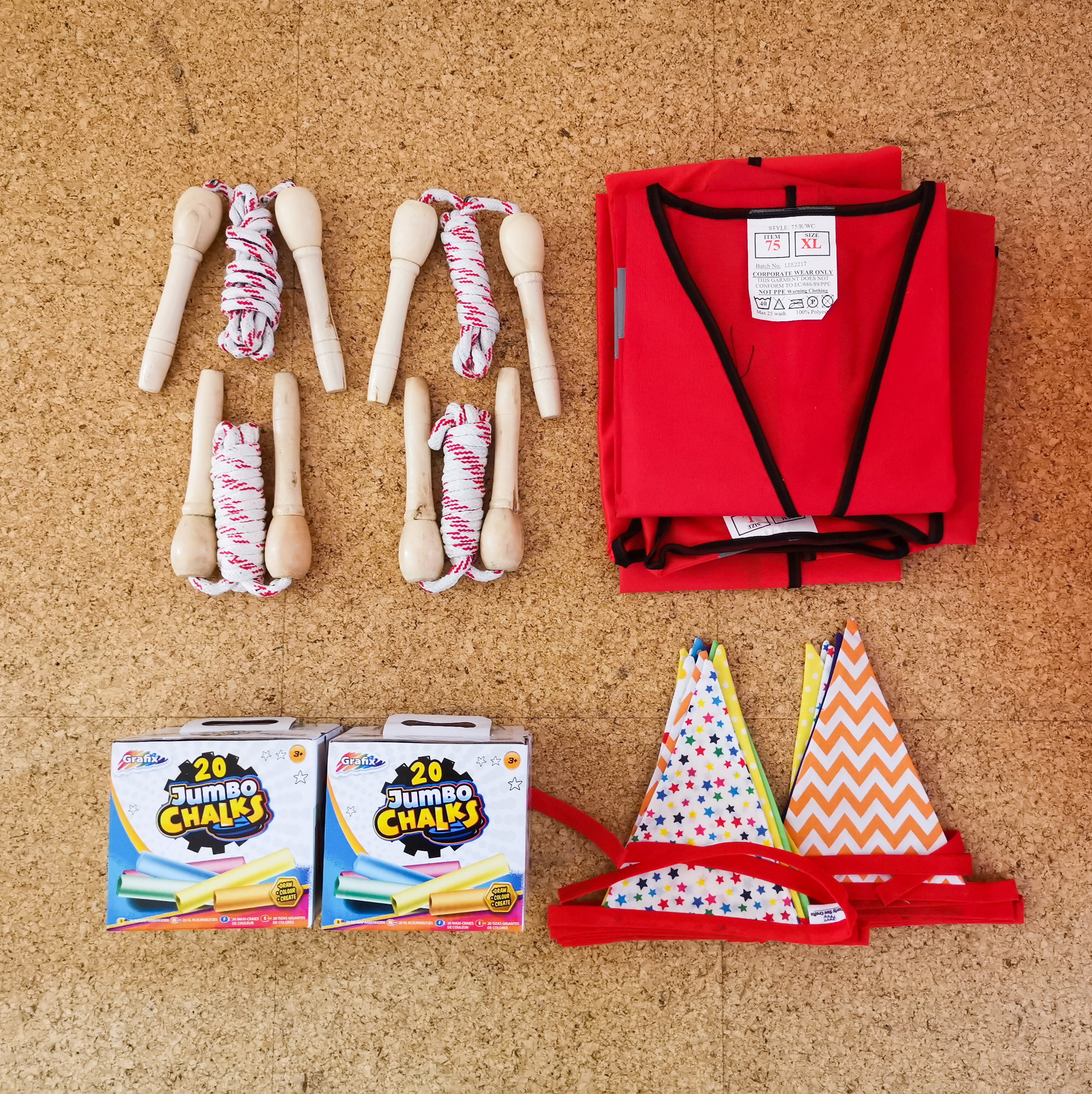 ✅ small games including skipping rope, skipping elastic, jacks, pocket kite, Velcro bat and ball and a football.