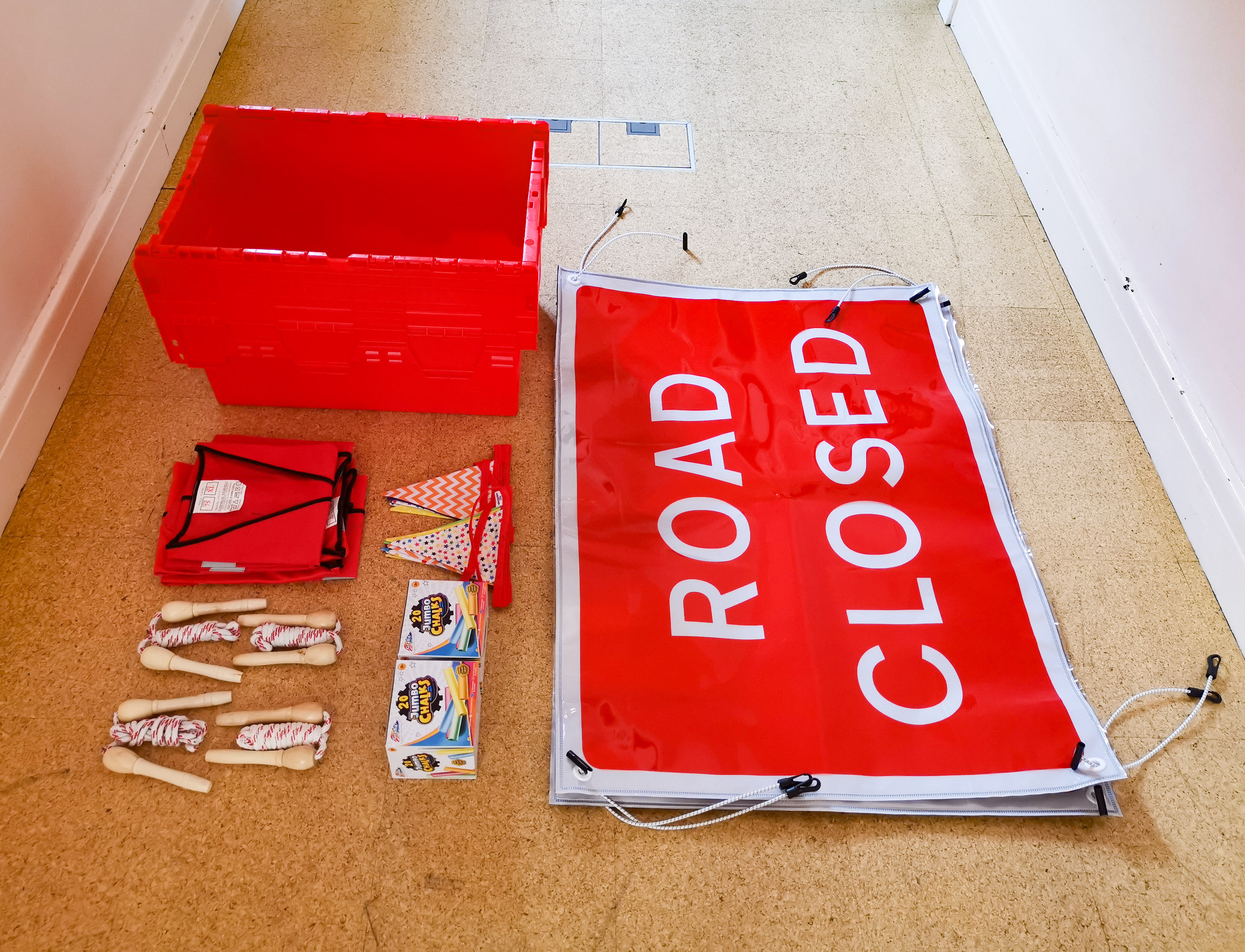 ? This medium sized plastic crate contains some useful items to get a play street up and running.